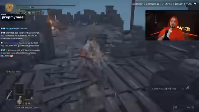01:23:27Der Streamer bewertet seinen Fortschritt und stellt fest, dass er über mehr Leben als Ausdauer verfügt, was den Fokus auf den Handel im Markt verlagert. Die strategische Entscheidung, sich auf den Blutungsschaden zu konzentrieren, wird bestätigt, auch wenn dies einige Bossen zu einer echten Herausforderung macht. Die gefundene Acht als brauchbare Waffe und die allgemeine Schwere der Challenge werden erneut thematisiert.