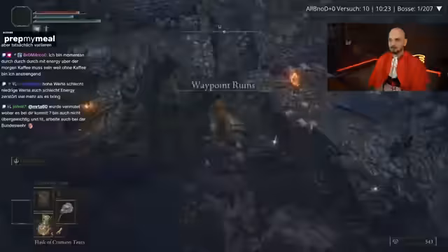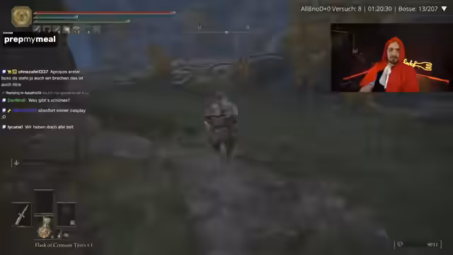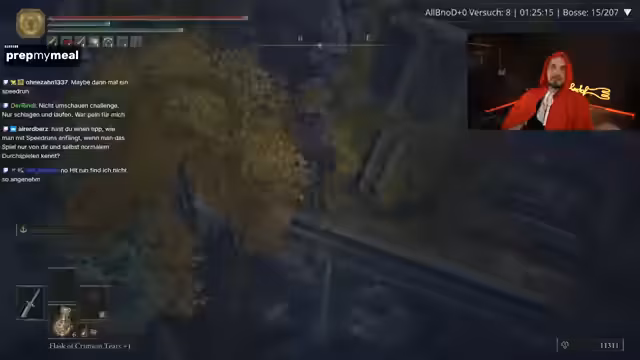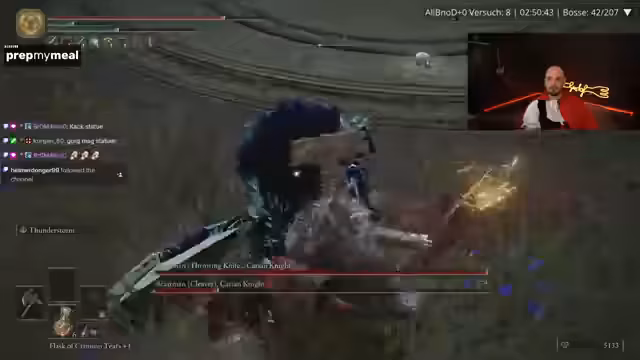 04:13:23Der Streamer startet eine Gaming-Session im Randomizer-Modus von Elden Ring und berichtet über seine Fortschritte. Er erwähnt, bisher mit dem Zufriedenheitsgrad bei Waffen-Spawns glücklich zu sein, und ist auf der Suche nach bestimmten Bossen wie Malenia, die für den Erfolg der Challenge entscheidend ist. Dabei bewegt er sich durch verschiedene Gebiete wie Limgrave und Raya Lucaria, kämpft gegen verschiedene Gegner und Boss-Gegner wie den Mesma Elite-Soldaten, den er aber meidet. Seine Anstrengungen zielen darauf ab, eine möglichst gute Ausrüstung zusammenzustellen, mit dem Fokus auf eine Hauptwaffe, die mehr Schaden ermöglicht. Die Herausforderungen werden als Teil des Spielspusses gesehen, auch wenn sie teilweise frustrierend sind.