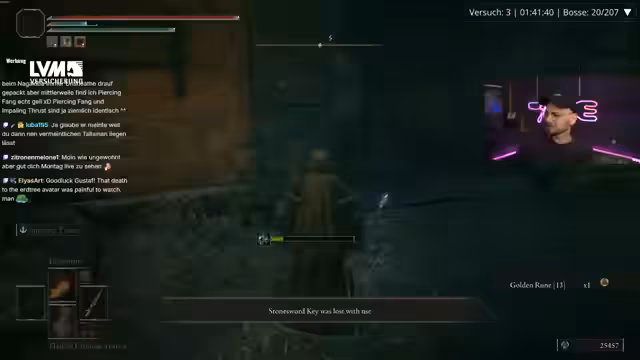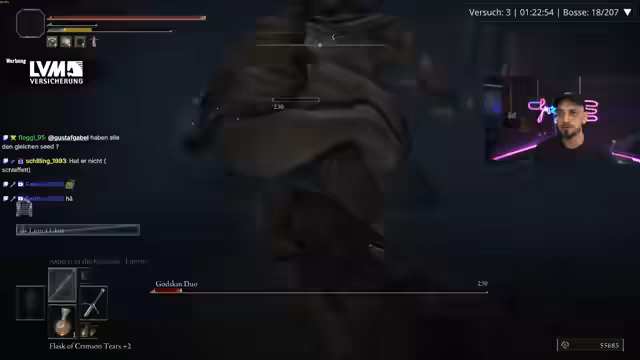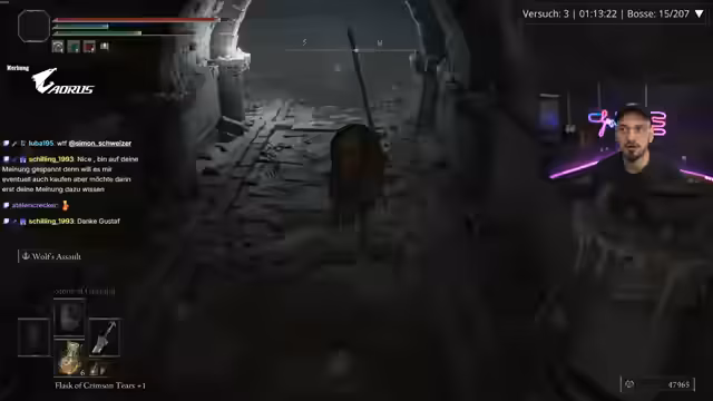 00:11:43Während des Runs erlebt der Streamer eine Achterbahnfahrt der Gefühle. Er findet zwar mehrere starke Waffen wie Backhand Blades und die Tränen der Helminth, kann diese aber aufgrund des hohen Scalinings der Gegner oft nicht effektiv nutzen. Er kämpft sich durch gefährliche Gegner wie den Godskin Duo, wird mehrmals nur knapp besiegt und verliert wichtige Gegenstände wie Margits Fessel, was seine Strategie erschwert.