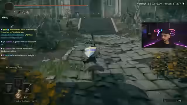 00:21:19Nach einem erfolgreichen Kampf gegen den Noble, den er nicht erwartete, steht der Streamer vor Margit, dem ersten Boss. Er bittet den Chat um Feedback und schlägt vor, seine Waffen aufzuwerten, statt neue zu suchen. Gleichzeitig kündigt er den bevorstehenden Sponsoringspart mit L'Oreal um 15 Uhr an, der sich um Jobangebote in Deutschland dreht, und wechselt die Stimmung von Gameplay zu Business.