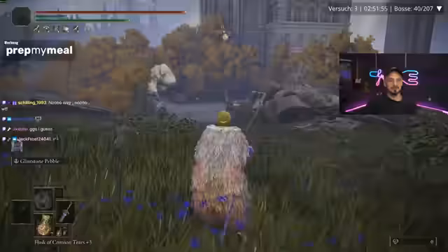 00:07:12Nach der Ankündigung von Hollow Knight wechselt der Streamer zu Elden Ring, wo er einen Randomizer-Run startet. Er erklärt, dass dies ein sogenannter !wette-!-Randomizer ist, bei dem die Zuschauer wetten können, ob er einen bestimmten Boss besiegen wird. Ziel des Runs ist es, möglichst viele Bosse zu besiegen und dabei gute Waffen zu finden, die ihn später im Spiel unterstützen können.