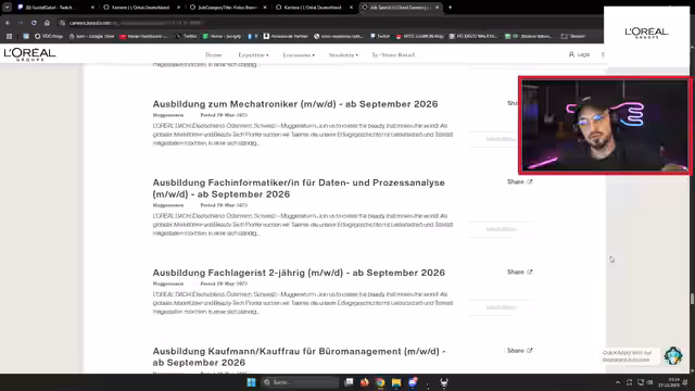02:12:22Der Streamer startet eine Kooperation mit L'Oreal. Diese Zusammenarbeit bezieht sich nicht auf deren Produkte, sondern darauf, offene Stellen in Deutschland zu bewerben. Es werden verschiedene Jobmöglichkeiten für Schüler, Studierende, Berufseinsteiger und erfahrene Fachkräfte vorgestellt. Der Streamer betont die Vielfalt der angebotenen Positionen und die Bedeutung eines guten Betriebsklimas.