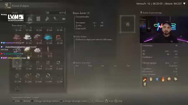 00:13:25Der erste Kampf des Streams findet gegen den Chevalier de Carrier statt. Mit einer neu erhaltenen Peitsche als Waffe gelingt es dem Streamer, den Boss ohne jeglichen Schaden zu besiegen. Nach dem Sieg werden mehrere Items gelootet, darunter eine neue Waffe und diverse Ausrüstungsgegenstände. Es wird entschieden, den Bereich zu verlassen und das gesammelte Equipment zu verkaufen, um Platz für zukünftige Beute zu schaffen.