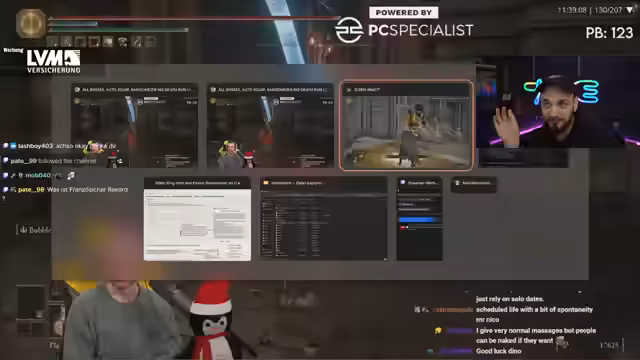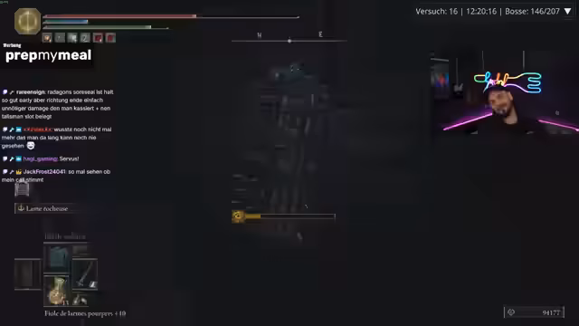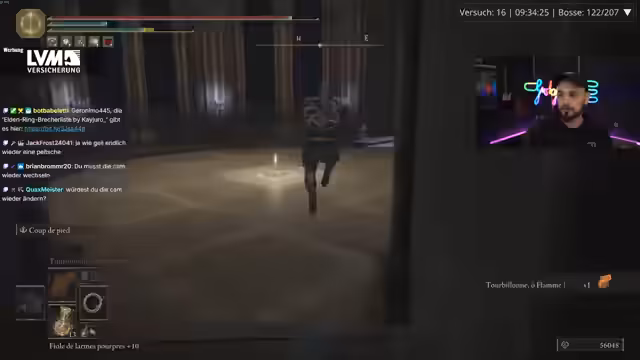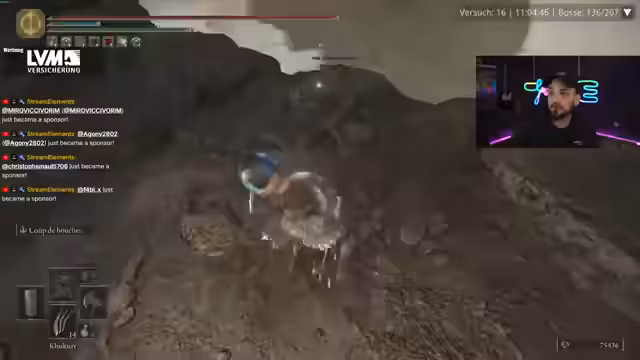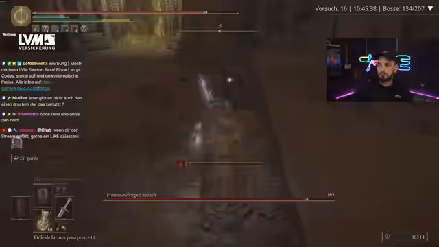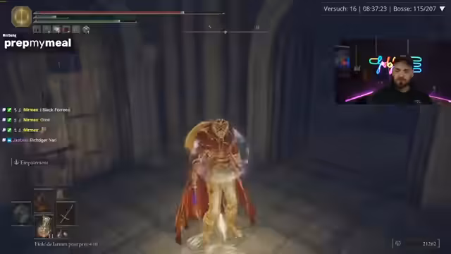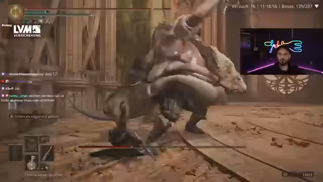 04:29:55Ein besonders kniffliger Bosskampf steht an, und der Streamer hat Bedenken, da ihm Fernkampf-Waffen fehlen. Trotzdem meistert er den Kampf gegen Margit mit den ihm zugeteilten, schwächeren Waffen erfolgreich. Im Anschluss daran wird ein Boss namens Chevalier de la Noble Proutification herausgefordert. Die zweite Phase dieses Bosskampfes wird zur existenziellen Bedrohung; der Streamer überlebt nur durch einen glücklichen Treffer und seinen erhöhten Lebenswert, was er selbst als 'reines Glück' bezeichnet. Der überstandene Kampf wird als triumphaler Wendepunkt des Streams gefeiert.