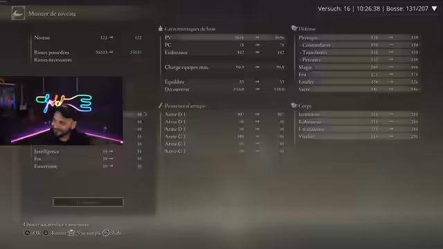 01:39:13Nach dem Sieg über einen Boss wird eine detaillierte Analyse der Statistiken vorgenommen. Der Streamer stellt fest, dass der Level-Unterschied von 35 Stufen bei Lebenspunkten kaum einen Vorteil bringt und kommt zur Überzeugung, dass Leveln in Ausdauer nach Erreichen von 45 Punkten ineffizient ist. Dennoch wird der weitere Weg in die Gezeiten fortgesetzt, um Morgots große Rune zu holen und den finalen Boss der Challenge zu bekämpfen.