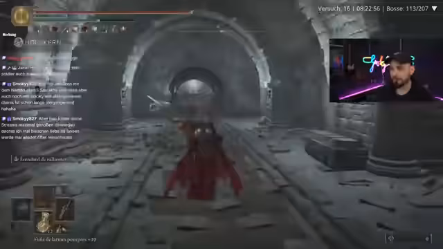 01:48:25Aufgrund eines gefallenen Talismans hat der Streamer weniger Lebenspunkte, was ihn in Bedrängnis bringt. Er befindet sich in einer gefährlichen Zone, die er als Katakomben bezeichnet, und muss sehr vorsichtig agieren. Manchmal ist er gezwungen, nicht gegen jeden Gegner zu kämpfen, um nicht in eine tödliche Falle zu geraten. Trotz seiner unzufriedenstellenden Waffe, die er als „Kackwaffe“ bezeichnet, überlegt er, wie er das Beste daraus machen kann und welche Gegenstände er für den weiteren Fortschritt benötigt, wie zum Beispiel Pfeile, die er kaufen kann.