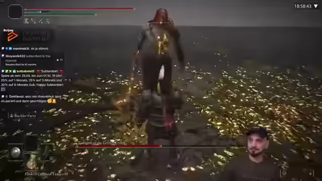 04:35:53Der Streamer kündigt ein Gewinnspiel in Partnerschaft mit Instant Gaming an, bei dem die Teilnehmer ein Spiel ihrer Wahl gewinnen können. Er erklärt, wie man über den Befehl '!Instant' auf die Seite gelangt und betont, dass man beim Bezahlen die Schweiz auswählen sollte, um Mehrwertsteuer zu sparen. Der Streamer lobt Instant Gaming als verlässlichen Partner und betont, dass er noch nie Probleme mit der Plattform hatte. Er richtet einen benutzerdefinierten Befehl '!Gewinnspiel' ein, um die Teilnahme am Gewinnspiel zu erleichtern. Anschließend wechselt der Streamer zu Elden Ring und setzt den 'Perry Only'-Lauf fort, obwohl er zugibt, dass er ihn heute wahrscheinlich nicht beenden wird. Er erwähnt, dass man über Instant Gaming auch PlayStation-Karten günstiger erwerben kann. Nach dem Starten von Elden Ring im Offline-Modus stellt der Streamer fest, dass er bereits 17 Stunden in den 'Perigard'-Lauf investiert hat. Er erinnert sich an den letzten besiegten Boss, Gideon, und bereitet sich auf den Kampf gegen Godric vor. Der Streamer zeigt sich begeistert von der Menge an Ausrüstung, die er tragen kann, und erklärt, dass der aktuelle Trank Perfect Parries ermöglicht, was den Kampf potenziell sehr schwer, aber auch spaßig machen wird.