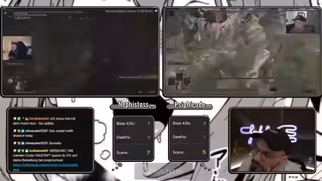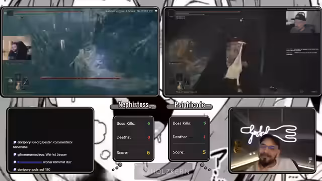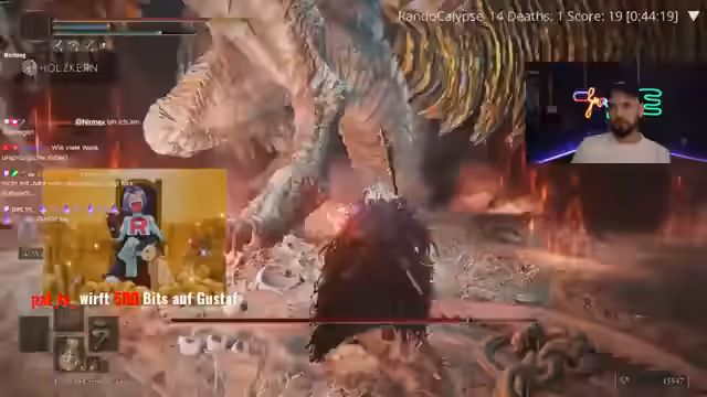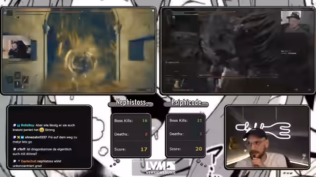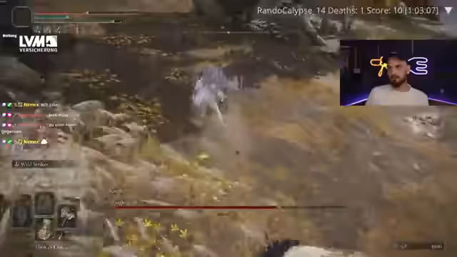 06:44:08Der Stream startet mit dem RandoCalypse Playoffs, einem Turnier im Elden Ring DLC. Der Streamer erklärt die Regeln: Jeder besiegte Boss gibt einen Punkt, jeder Tod kostet einen Punkt. Die Spieler Nephistos und Psy beginnen ihre Runs. Frühe Kämpfe zeigen Nephistos' starke Performance mit kontrolliertem Spiel und wenig Fehlern, während Psy ebenfalls konsequent spielt. Der Punktestand ist zunächst ausgeglichen, mit beiden Spielern auf ähnlichem Niveau.