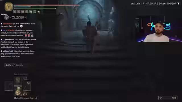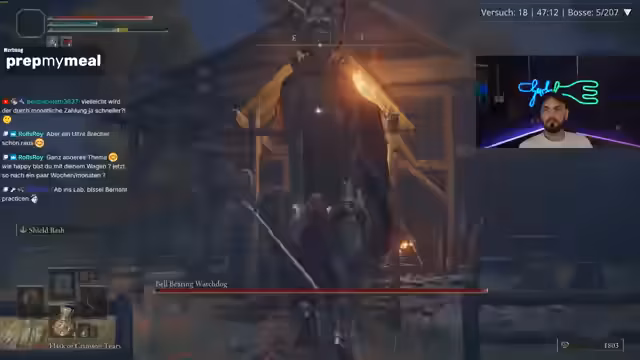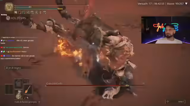 01:58:39Der Streamer kämpft sich durch weiterhin anspruchsvolle Gegner, darunter einen Deathbird und einen Drachen. Ein unüberlegter Angriff führt zu einem vermeidbaren Tod, was als großer Fehler gewertet wird. Die Diskussion kreist um Punkteeffizienz: Bosse auszulassen sei akzeptabel, wenn Tode vermieden werden. Die Ausrüstung wird mehrfach optimiert, um verschiedene Schadensarten (Feuer, Heilig) zu nutzen. Ein besonders schwieriger Kampf gegen Radagon kostet unnötig Punkte, da der Streamer zwischen Angriff und Heilung zögert.