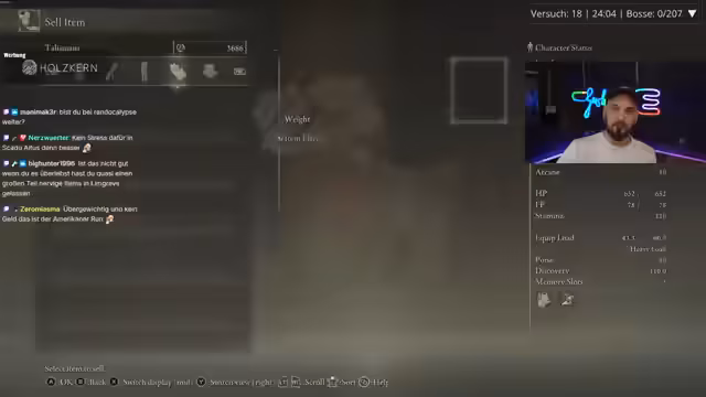 00:14:29Der Streamer bewertet seine Vorbereitung: Er hat einen schlechten Talisman und wenig Verteidigung, was als riskant eingestuft wird. Mods wie Convergence und Boss-Mod werden diskutiert, wobei klar wird, dass er sich trotzdem für das Turnier auf Englisch umstellen wird. Die Diskussion zeigt seine Sorgen über die Ausstattung und die Notwendigkeit von Anpassungen.
