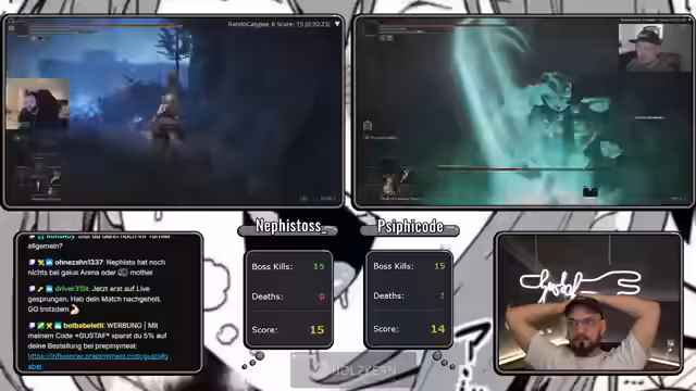06:42:01Das endgültige Ergebnis wird nicht klar, aber Nephistos führt knapp mit 8:7. Kritisch wird die Waffenwahl von Psy bei späteren Kämpfen bewertet, während Nephistos' Knowledge der Boss-Mechaniken als stark hervorgehoben wird. Der Streamer verweist auf weitere Turnier-Matches am Folgetag und dankt den Organisatoren für das aufwendige Overlay, das die Übersicht verbessert hat.