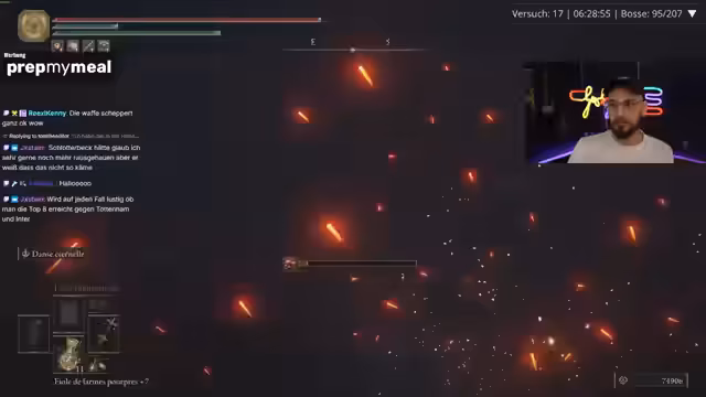 04:26:40Der Streamer kämpft sich durch die French Challenge, sammelt Waffen und Gegenstände, aber kämpft mit Herausforderungen wie Übergewicht und mangelnden Upgrade-Möglichkeiten. In einem intensiven Bossfight gegen einen Gegner in einer Arena mit Lasern verliert er mehrfach, schafft es aber letztlich, den Boss zu besiegen. Er analysiert die Schwierigkeiten, insbesondere die schlechte Sichtbarkeit und die unerwarteten Schadensmuster, und betont, dass der Sieg trotz der Widrigkeiten ein Erfolg war.