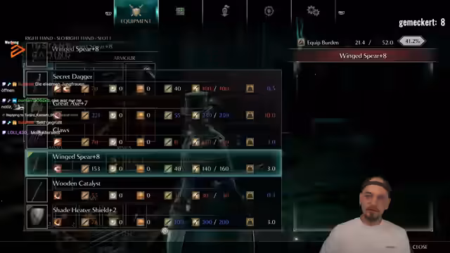 03:24:53Der Streamer diskutiert über die Entwicklung seiner Waffe im Spiel. Er stößt auf Schwierigkeiten beim Aufleveln seiner aktuellen Waffe, da er benötigte Materialien wie Sharpstone Chunks und Large Sharpstone Shards nicht mehr findet. Überlegt, ob er eine andere Waffe nutzen soll, wobei Stichwaffen aufgrund ihrer Geschwindigkeit und Flexibilität bevorzugt werden. Er erkundet verschiedene Waffenoptionen, darunter Runenschwert und S-Doc, Hiltless, aber keine erweist sich als überlegen. Die aktuelle Waffe skaliert nur mit C, was die Situation kompliziert.