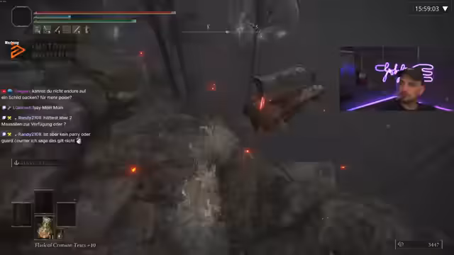 01:36:50Nach mehreren Versuchen und Fehlern bei der Guard-Counter-Tier ärgert sich der Streamer über seine Ungeduld und das häufige versehentliche Treffen mit dem Bell. Er vergleicht sich mit Gino, dem besten Spieler der Welt, und stellt fest, dass er viel länger braucht. Der Streamer hat Schwierigkeiten, die Angriffe richtig zu timen und verbraucht oft das Mana für den Bell anstatt für den Parry, was die Challenge unmöglich macht.