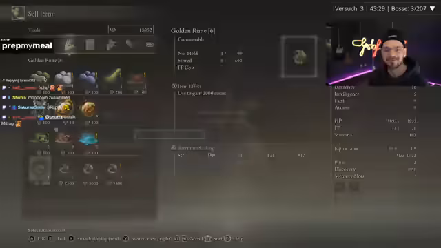 03:27:05Eine neue Waffe, ein Great Ohm Killer Cleaver, wird vorgestellt. Das Item wiegt nur 1,5 und bietet die Möglichkeit, Parieren zu lernen, was den Streamer begeistert. Er erkennt, dass er eine Verteidigungs-Waffe benötigt, da der aktuelle Schaden zu niedrig ist, um Bosse effektiv zu besiegen. Nach einem Kampf, in dem er fast stirbt, wechselt er zu einer Sacred Rotten Greatsword und zu einem Poison Great Ohm Killer Cleaver, um mehr Effekte abzudecken.