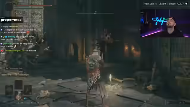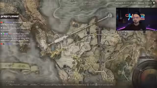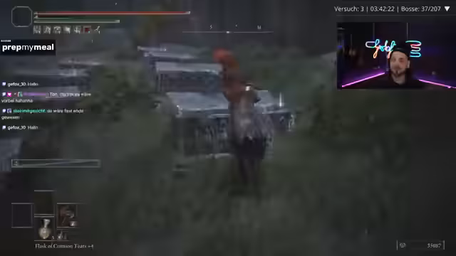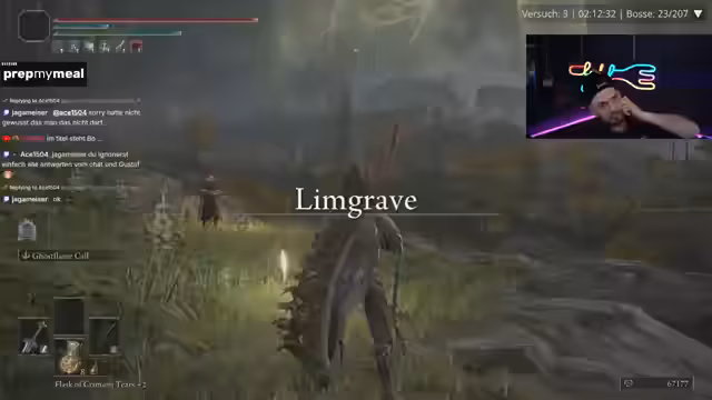 00:14:23Im Spiel wird ein sehr schwieriger Bosskämpfe gegen 'Rick' unternommen, der als unerwartet hart beschrieben wird. Der Streamer kämpft mit mangelhafter Ausrüstung und hat wenig Schaden, was die Kämpfe in die Länge zieht. Er erkundet verschiedene Regionen wie 'Gordrick' und 'Limgrave', findet aber keine nützlichen Gegenstände oder Waffen. Trotzdem bleibt der Streamer optimistisch und hofft auf eine Verbesserung der Ausrüstung.