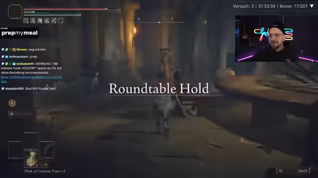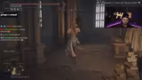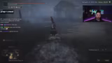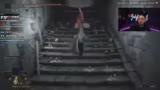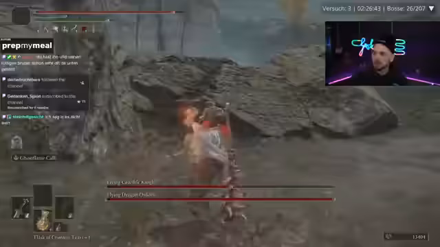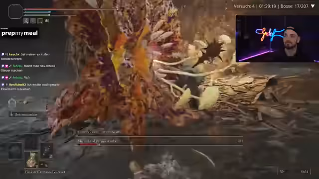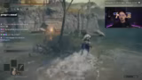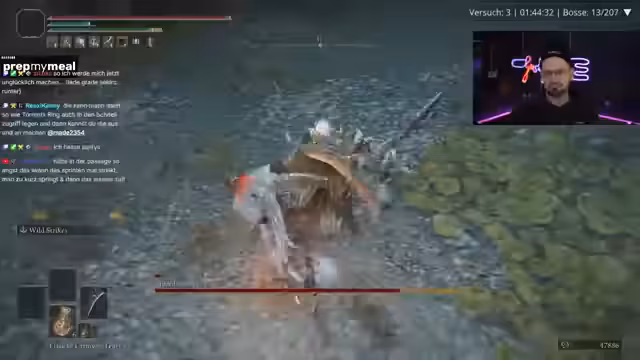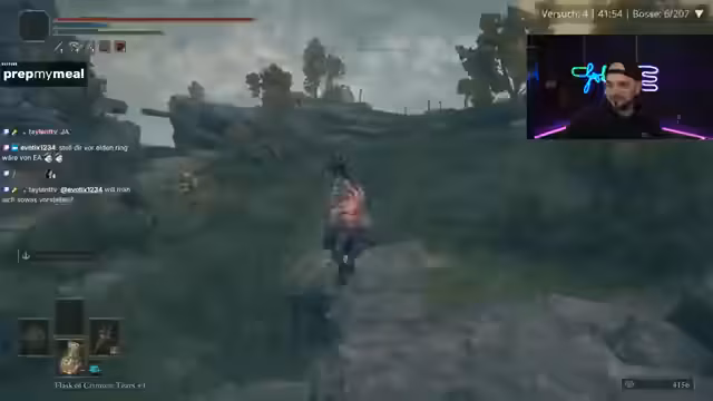 04:50:54Ein Kampf gegen einen normalen NPC-Knopf entsteht, der als nervig und albern empfunden wird. Kurz darauf stirbt der Streamer durch eine 'Spoiler Hand', eine Kreatur, die aus dem Nichts auftaucht und den Spieler gegen eine Wand presst, gefolgt von einem exzessiven Schadenangriff eines DLC-Reiters. Dieser Tod verdeutlicht die extremen Zufallsereignisse und unbeabsichtigten Todesfälle im Spiel.