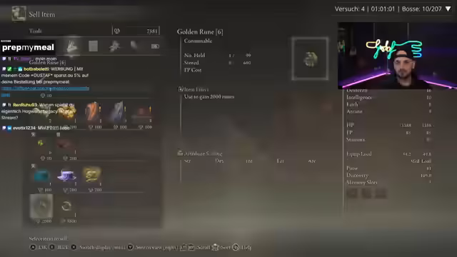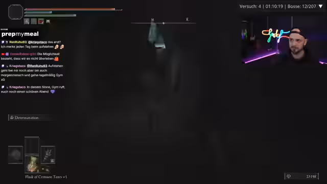 04:45:39Nach dem Kauf eines Levels beim Händler stellt der Streamer fest, dass die Beute nach dem Sieg über einen Boss exakt dieselben Items sind, wie zuvor schon einmal erhalten. Er wechselt das Ziel und will stattdessen eine große Rune farmen, um dann endlich alle gesammelten Runen einzulösen. Es wird die große Varianz des RNG-Spiels deutlich, die sowohl Frustration als auch gelegentlich kleine Glücksmomente erzeugt.