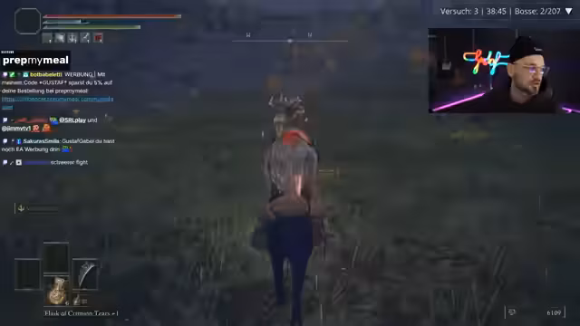 03:48:26Bevor der letzte Boss der Session getötet wird, macht der Streamer eine Essenspause. Er präsentiert dem Chat den Sponsoren 'Prep My Meal', der hochwertige Tiefkühlgerichte anbietet. Er zeigt verschiedene neue Gerichte, die bestellt werden, wie Hähnchen-Buffalo-Boat und Käsespätzle mit Hähnchen, und lädt die Community ein, mitzubestellen. Er erwähnt dabei seinen Namen Gustaf Gabel und Chat 5% Rabatt.