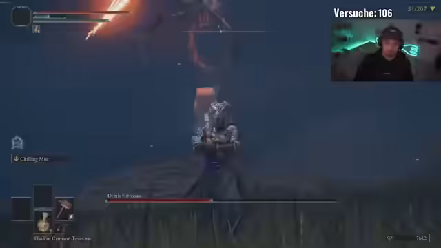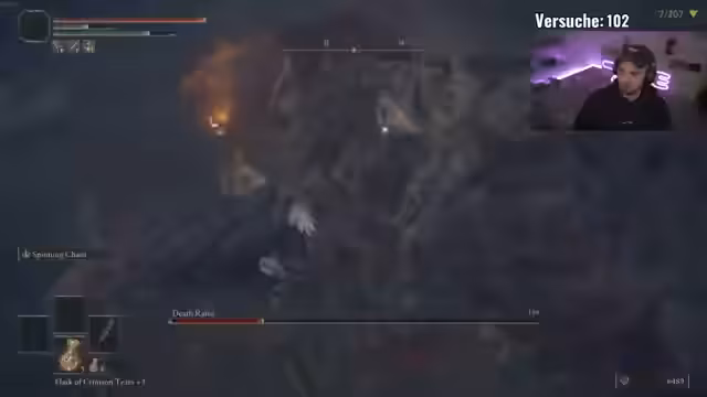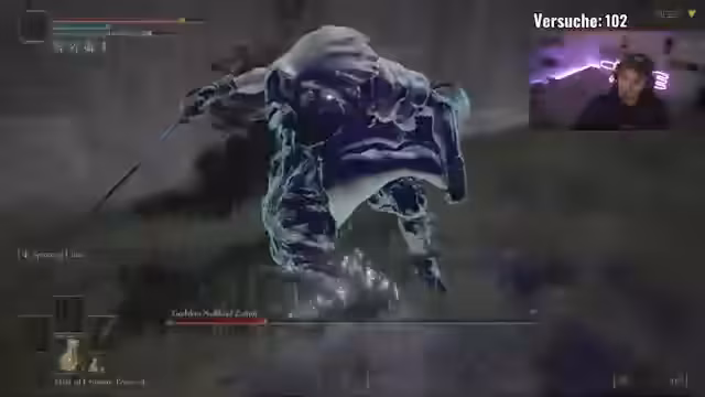 04:08:29Der Streamer berichtet von seiner aktuellen Challenge, einem 'All Bosses No Death Randomizer', bei dem er seine Waffe nicht aufleveln darf. Er beschreibt, wie dies den Schwierigkeitsgrad immens erhöht, besonders gegen DLC-Bosse wie Rakshasa. Er kämpft gegen den Boss, der sich heilt und sehr viel Schaden anrichtet, und muss sich auf seine Rotation und Ausweichen konzentrieren, um nicht zu sterben und den Rekord von 85 zu übertreffen.