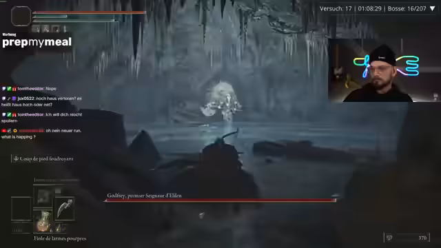 02:12:06Die Spieler starten die 'French Challenge' mit einem gemeinsamen Seed und diskutieren über ihre Anfangsausrüstung und die ersten Bosse. Ein Spieler hat die 'Gaius Waffe' und den 'Arsenal Charm'. Sie stellen fest, dass ihr 'Obel' nicht mehr aktiv ist, da er den 'Wendem' heruntergeladen hat. Sie beginnen die Challenge und hoffen, dass sie funktioniert. Es wird spekuliert, welcher der erste Boss sein könnte, wobei Vorschläge wie 'Malenia', 'Tree Sentinel' und 'Bail' fallen. Ein Spieler stirbt schnell und beklagt die Schwierigkeit des Spiels, da er zu 'cocky' war. Die Spieler bemerken, dass die Runenmenge, die sie erhalten, nicht normal ist und vermuten, dass dies an der französischen Mod liegt. Sie finden schnell eine 'kranke Asche' und sind motiviert, den 17. Versuch als den richtigen Versuch zu meistern.