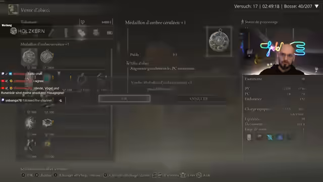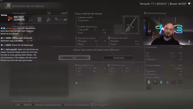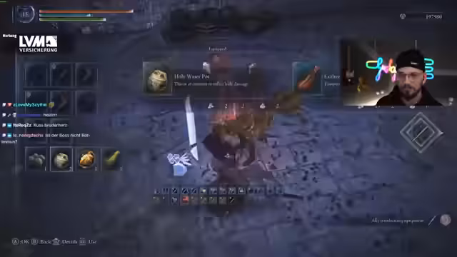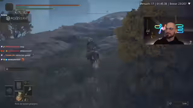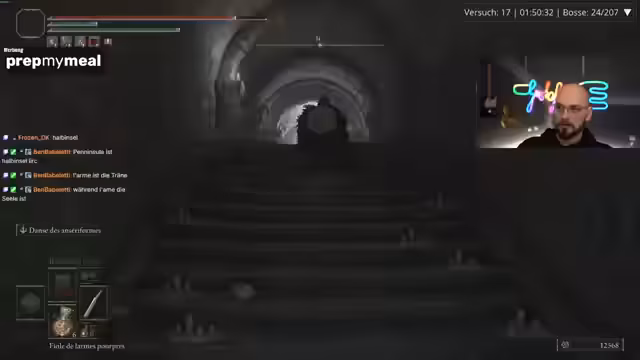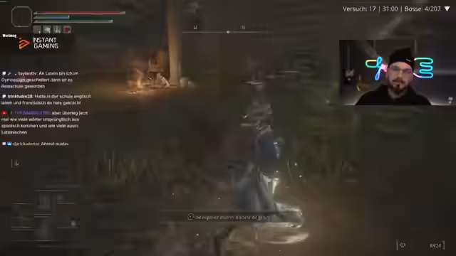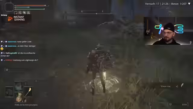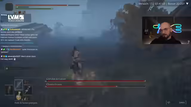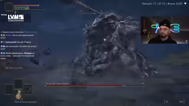 03:55:08Der Streamer kämpft sich durch das Spiel und äußert seine Schwierigkeiten mit der französischen Sprache, die in Chat-Nachrichten verwendet wird. Er gibt zu, dass er null Französischkenntnisse besitzt, was die Kommunikation und das Verständnis bestimmter Kommentare erschwert. Während des Spiels entdeckt er einen Neunerstein, dessen Kosten jedoch sehr hoch sind. Er identifiziert ein unbekanntes Item, das nicht von Moog oder Morgat stammt, und ist unsicher über dessen Herkunft. Trotz fehlender spezifischer Items stellt er fest, dass seine aktuelle Ausrüstung im Allgemeinen sehr stark ist. Er experimentiert mit neuen Wegen, um sich durch die Spielwelt zu bewegen, und hofft, bald ein Upgrade für seine Flasche zu finden. Besonders beeindruckt ist er von der Kombination zweier Talismane, die er als äußerst mächtig empfindet, bedauert aber, dass diese nicht mehr verfügbar sind. Er zweifelt an seinem Verständnis der Spielmechaniken, insbesondere wenn es um die Effektivität bestimmter Waffen wie der doppelten Explosionsträne geht, die er noch nie zuvor erlebt hat und deren Potenzial er gerne gegen einen Boss testen würde, sofern die Situation dies zulässt.