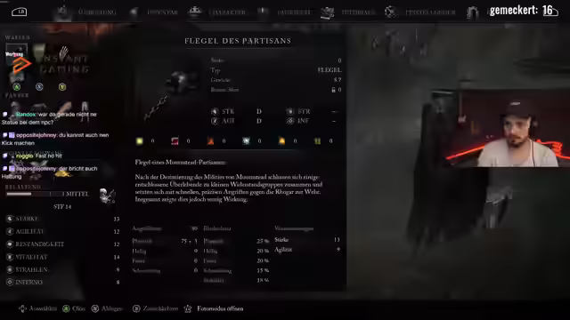 01:44:46Der Streamer äußert sich positiv über das Spiel, lobt die Grafik, die Atmosphäre und den bisherigen Spielspaß. Er erkundet die Spielwelt, findet Waffenaufwertungen und hadert mit der Orientierung. Trotzdem genießt er das Spiel bisher und ist gespannt auf die weiteren Herausforderungen. Er bedankt sich für Tipps im Chat, bittet aber darum, ihn nicht permanent mit Lösungen zu versorgen, da er das Spiel lieber selbst erkunden möchte. Er kämpft mit Gegnern, wechselt zwischen der normalen und der Umbralwelt, um weiterzukommen, und findet kleinere Geheimnisse, die ihm Spaß machen. Er entdeckt den Schild des blutroten Rektors, kann ihn aber noch nicht benutzen. Die Stimme der Charaktere gefällt ihm sehr gut. Er sucht weiterhin nach einer Möglichkeit, seine Waffen aufzuwerten.