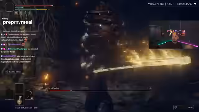 02:04:32Es wird erwähnt, dass Faith benötigt wird, um ein bestimmtes Item zu nutzen, was aktuell nicht möglich ist. Der Godskin Snail wird besiegt, was als wichtiger Erfolg gewertet wird. Es wird festgestellt, dass Noble Presence nicht so schwer auszuweichen ist, wenn man nicht wie in der ersten Phase kämpft. Es wird betont, dass alles im Spiel erlernbar ist und dass es cool ist, dass man immer sagen kann, ja, weiß ich jetzt zwar noch nicht, aber kann man ja lernen. Lobel ist beim Parry einfacher. Es wird darauf hingewiesen, dass jeder Run durch Fallen beendet sein kann und man aufpassen muss. Es wird festgestellt, dass die beste Attacke des Gegners das Schlagen von Wurzeln ist. Der Musikgeschmack des Streamers wird diskutiert.