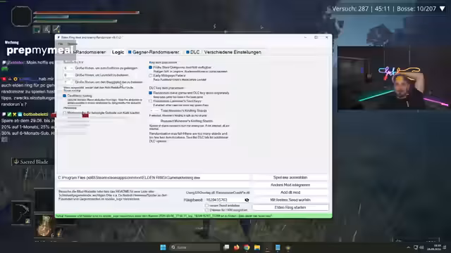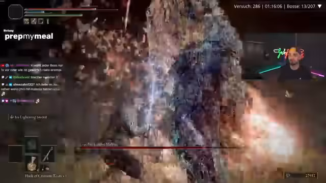 00:25:04Der Streamer beginnt mit dem Spiel Elden Ring und stellt das aktuelle Format vor: AllBosseNoDeath, ohne Waffen-Upgrades, im Zufallsmodus. Er erklärt, dass er nicht plant, Harry-only zu spielen und sich den Spielverlauf spontan gestalten lassen will. Ein schwieriger Gegner namens Radahn wird als besonders fordernd beschrieben, insbesondere weil er in der zweiten Phase Attacken verwendet, für die man anders ausweichen muss als in der ersten. Dies als "gemein" vom Spiel empfundene Mechanik wird als eine der größten Hürden im Run angesehen.
