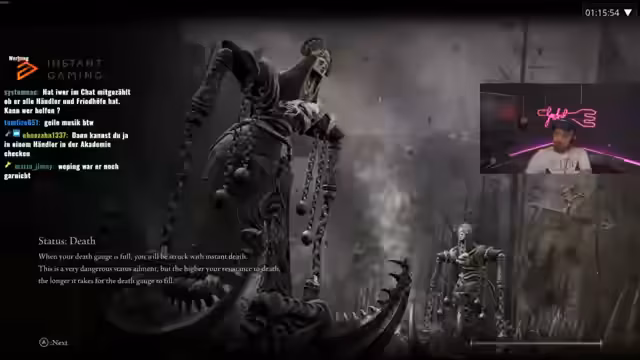 01:51:21Nach dem Tod erkundet der Streamer erneut einen Bereich, den er zuvor übersehen hatte. Er stellt fest, dass die entdeckten Gegner stärker sind und bringen ihm neue Skill-Punkte. Die Ausrüstung der Gegner gibt ihm wertvolle Gegenstände, wie 'Red Mercury Essence', die für Upgrades unerlässlich sind. Er kämpft gegen eine Vielzahl von Gegnern, darunter auch Boss-ähnliche Figuren, und merkt an, dass die Parry-Mechanik gegen bestimmte Gegner sehr effektiv ist.