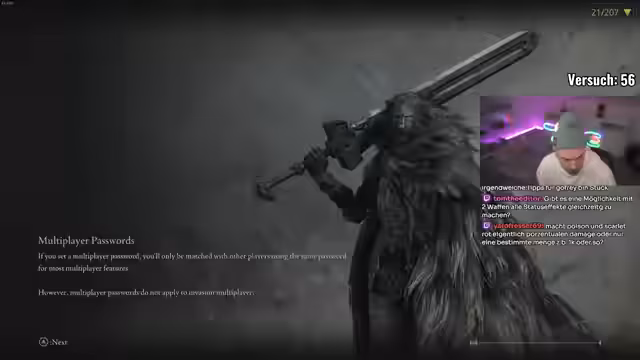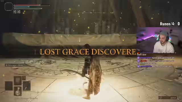 02:39:42Die Waffe, die für einen Skill verwendet wird, wird mit der Fähigkeit eines NPCs aus dem DLC verglichen, der schnell auf den Gegner zurennt. Es wird die Frage aufgeworfen, ob der Streamer wieder eine 20er Serie startet. Nach dem Erhalt der Erbleed wird festgestellt, dass diese nicht mit Frost belegt werden kann. Das gefundene Grace wird als wichtig erachtet, um sich im Notfall retten zu können. Die Waffe wird als potenziell eine der besten im Spiel bezeichnet. Es wird kurz auf Mimic eingegangen und empfohlen, nicht damit zu spielen. Die Route führt Richtung Precipice, wobei der Streamer aufgrund der noch schwachen Waffe (plus 0 oder maximal plus 1) nicht hineingehen wird. Ein Runa soll im Aufzug benutzt werden. Die Waffe White Strikes wird als langsamer als die aktuelle Waffe bezeichnet, die Jumping Attacks und Running R2s ausführt, die mehrfach treffen. Der hohe Stamina-Verbrauch der Waffe wird als Balancing-Faktor genannt. Es wird die Frage aufgeworfen, ob Holy Damage gewünscht ist. Es werden Smithing Stones gefunden, und falls keine Samba gefunden wird, wird ein Wechsel der Waffe in Betracht gezogen.