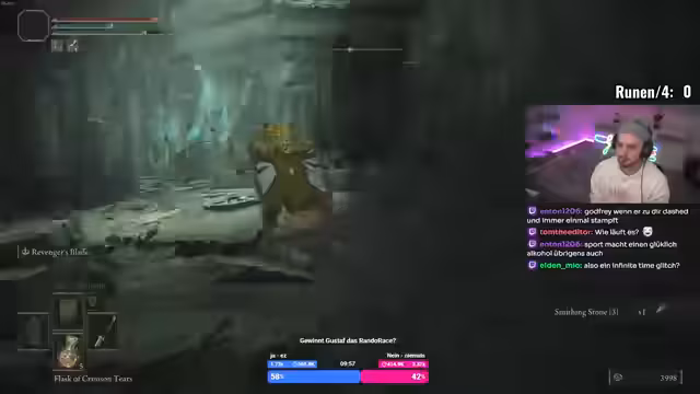 03:59:39Es wird ein 9er-Stein gefunden, die Suche nach einem 10er-Stein geht weiter. Der Streamer äußert die Vermutung, dass das Spiel mit einem +9 Upgrade der Waffe durchgespielt wird. Er bittet die Zuschauer um Unterstützung und erwähnt, dass er die Genki-Dama aktiviert hat. Er bezeichnet einen Kampf als 'for free', da er den Gegner in einem günstigen Moment erwischt. Es wird kurz über den Super Bowl gesprochen, zu dem der Streamer in einer Gruppe gehen wird, obwohl er sich nicht aktiv mit American Football beschäftigt. Er gesteht, dass er sich vor Drogen fürchtet und Respekt hat, und dass er vermutet, dass er das Spiel mit plus 9 beenden wird. Ein Köderversuch mit goldenen Items scheitert. Er betont die Wichtigkeit, objektiv über Probleme zu sprechen, und verteidigt sich gegen den Vorwurf des 'Osten-Bashings' im Zusammenhang mit einem Meth-Problem.