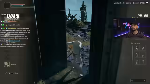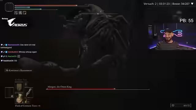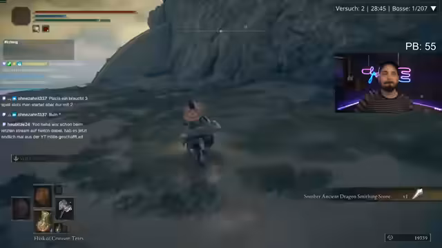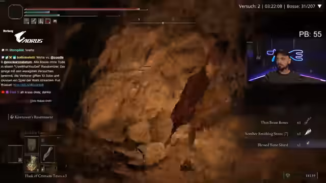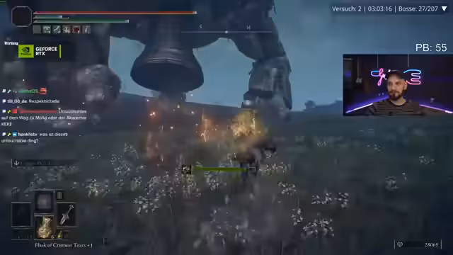 04:03:27Nach einigen anfänglichen Rückschlägen und Toden in Limgrave gelingt es dem Streamer, Bossen wie Tree Sentinel und General Radahn zu besiegen. Er findet ein wichtiges Item, das ihm erlaubt, die Schwere zu entfernen, was für das Gameplay entscheidend ist. Trotzdem ist der Anfang der Challenge sehr fordernd, da die zufälligen Waffen oft schlecht auf die Bosse abgestimmt sind und kaum Schaden anrichten. Die Beteiligung der Community ist hoch, mit Vorschlägen und Reaktionen auf die Kämpfe.