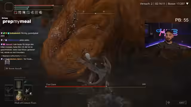 03:13:51Der Streamer kämpft weiter mit seiner ihm zugewiesenen, schlechten Fäusten-Waffe in Elden Ring. Er ist übergewichtig, was die Kämpfe zusätzlich erschwert, und findet keine_upgrade-Materialien. Dies führt zu großer Frustration. Gleichzeitig erzählt er humorvoll seine Pläne für Halloween und führt eine Diskussion mit dem Chat über unterschiedliche Meinungen, was den Spielspaß betrifft.