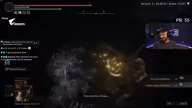05:39:02Der Stream beginnt mit einem äußerst schwierigen Kampf gegen einen Boss in Limgrave. Der Streamer und sein Co-Streamer @genossejuke haben große Probleme, den Gegner zu besiegen, da er unvorhersehbare Angriffe und einen hohen Magieschaden gegen ihre Frost-Waffe hat. Nach anfänglichen Rückschlägen und einem langen Kampf, der über zweieinhalb Stunden dauert, gelingt es ihnen schließlich, den Boss zu besiegen. Der anschließende Loot ist reichhaltig und umfasst Talismane, Waffen und Gegenstände, die den Spielstil signifikant verbessern. Es wird die neue Balliste 'Celebrant Sickle' gefunden, die mit plus 14 aufliegbar ist. Entscheidend ist, dass sie alle verfügbaren Items im Gebiet sammeln, was die Ressourcen für die Aufwertung von Waffen stark erhöht.