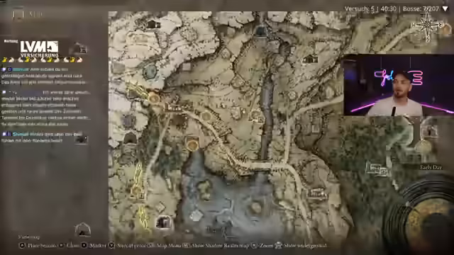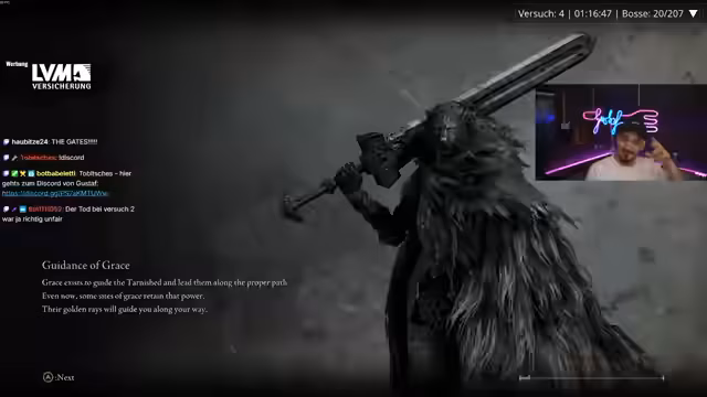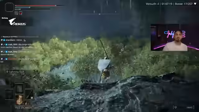 06:20:18Der Stream beginnt mit einem Elden Ring Run unter der 'use what you get'-Regel. Das bedeutet, dass alle aufgesammelten, ausrüstbaren Items automatisch ausgerüstet werden. Spielerische Herausforderung besteht darin, alle Bosse ohne zu sterben zu besiegen. Eine anfängliche Schwierigkeit ergab sich aus der Übergewichtigkeit des Charakters, was durch das Einsammeln zu schwerer Ausrüstung und Items wie 'Obsidian Lamina' entstand. Dies führte zu frustrierenden Kämpfen und Problemen bei der Ausführung von Angriffen und Ausweichmanövern.