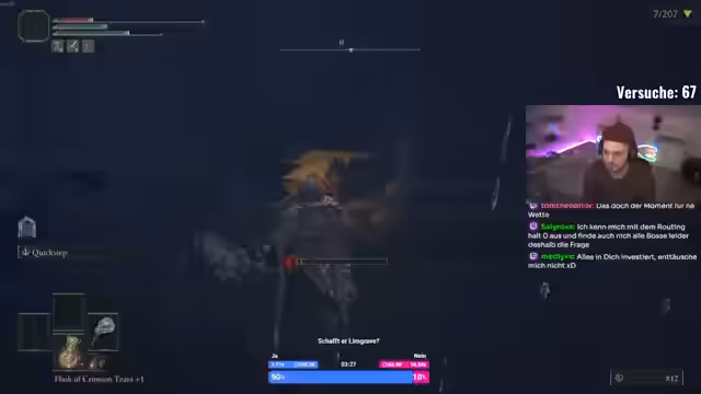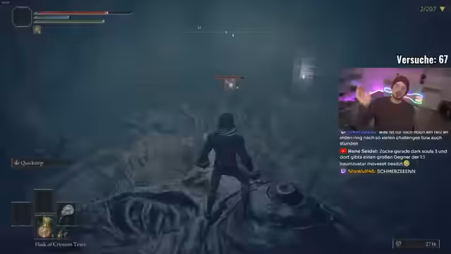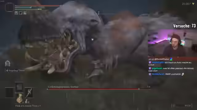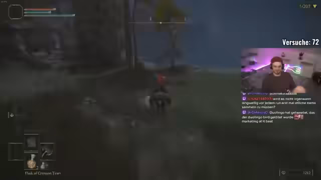 01:13:38Gegen Anfang des Streams kämpft der Streamer gegen mehrere schwierige Gegner in Limgrave. Er beschäftigt sich mit einem Boss, der ihn unerbittlich verfolgt und dabei in Wänden stecken bleibt, was die Kämpfe gefährlich macht. Besonders problematisch ist der Boss Lektary, bei dem der Streamer durch einen Schnitzer stirbt und resigniert feststellt, dass dieser Gegner ohne perfekte Vorbereitung und Wissen über Waterfall-Attacken unmöglich zu besiegen ist. Es herrscht eine hohe Frustration über die unfaße Bedingungen und die geringe Überlebenschance.