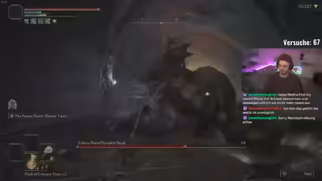 03:53:10Ein Drachenboss in einer kleinen Höhle erweist sich als besonders schwierig, da er ununterbrochen angreift. Der Streamer kämpft gegen mehrere starke Bosse, darunter Mindress, von dem er massiv Schaden von Gift-Angriffen erhält, und gerät in einen sehr langen und unangenehmen Kampf. Ein Problem mit der Kamera, die bei der Drachenmutter zoomt, erschwert den Überblick über die Situation erheblich.