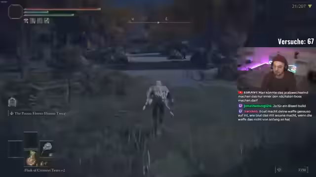 01:17:42Der Streamer experimentiert intensiv mit verschiedenen Waffen und ihren Effekten. Er erkundet die Mechanik der Ascheblume Flower Bloom Twice und stellt fest, dass sie bei gleichzeitigem Gift- und Deadly-Poison-Status einen extrem starken Schaden verursacht. Eine Waffe, die ihm besonders auffällt, ist die Kreuznaginata, mit der er Gegner mit einem speziellen Gift versehen kann. Er ist sich unsicher, ob dieses Verhalten ein Bug ist, ist aber begeistert von der unkonventionellen und mächtigen Build-Möglichkeit.
