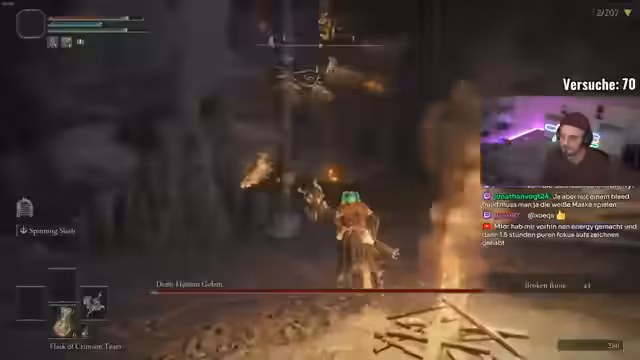 01:52:49Der Streamer äußert Frustration darüber, dass er immer wieder von einem bestimmten Löwen im Nahkampf getötet wird, und dass er in der aktuellen Situation machtlos ist, da er nicht genügend Schaden verursacht, um die Adds schnell genug zu besiegen. Er beschreibt, wie er in einer kleinen Arena spawnt und von den Adds überwältigt wird, was in den letzten Runs mehrmals zum Tod geführt hat. Der Streamer bezeichnet die Situation als gemein und erklärt, dass er nicht einmal die Chance hatte, gegen Malenia zu kämpfen. Er sieht den aktuellen Gegner als unbesiegbar an, da er dessen Fähigkeiten nicht ausweichen kann und die Adds nicht schnell genug töten kann. Der einzige mögliche Counter wäre ein Talisman, der die Death-Welt erhöht und Death-Welt-Healing bietet. Der Streamer startet einen neuen Seed und holt sich eine Müller-Milch und ein Kinder-Maxi-King. Er bedankt sich bei den Zuschauern für ihre Unterstützung und erklärt, dass er Fallschaden weniger schlimm findet als die aktuelle Situation, da er nicht weiß, was er besser machen soll. Er spekuliert darüber, ob er mit Glück oder einer guten Eigenschaft die Adds direkt beim Spawnen töten könnte, aber ohne den nötigen Schaden ist dies unmöglich.