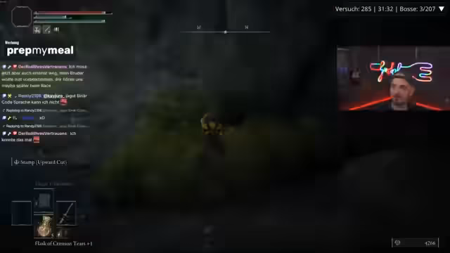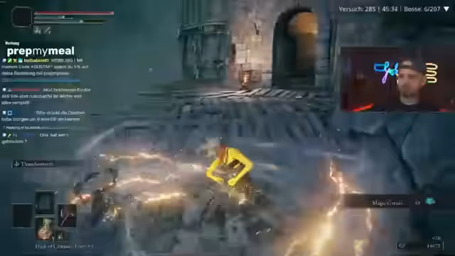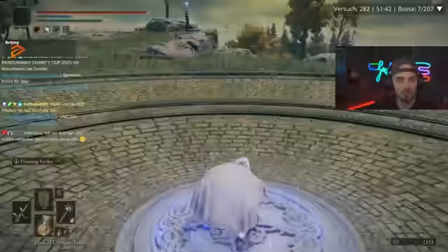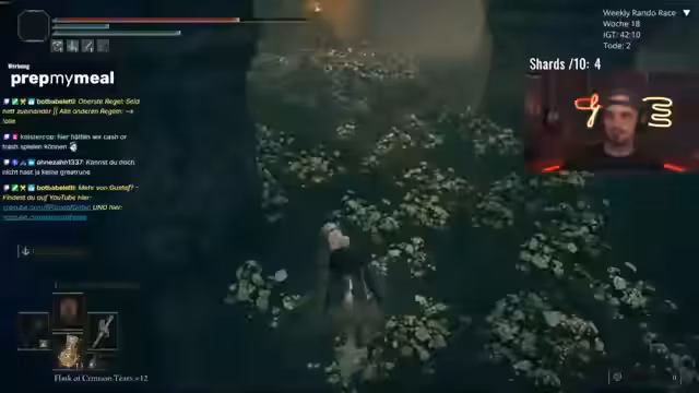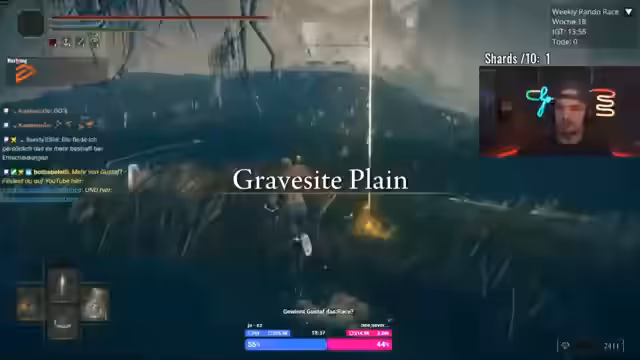00:01:09Gustafgabel beginnt den Stream, begrüßt sein Publikum und stellt den Elden Ring Randomizer vor. Er erwähnt seine große Begeisterung für das Spiel und dessen Soundtrack, speziell Techno. Nach einem kurzen technischen Test startet der eigentliche Rando-Run, bei dem alles zufällig ist: Bosse, Gegner und Items. Er hat jedoch Schwierigkeiten, sich an den gestrigen Bossnamen zu erinnern, was zu einer kurzen Chat-Interaktion führt.