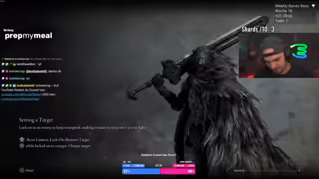 03:28:26Gustaf kündigt ein bevorstehendes DLC Rando Race für 18 Uhr an. Er erklärt, dass bei dieser Challenge alle Bosse im DLC ohne zu sterben (All Bosses, No Death) absolviert werden müssen. Die Regeln sind festgelegt: Start auf Level 30 mit einem Care Package von 50 Items. Alle wichtigen Key-Items für den DLC sind in einem zentralen Shop verfügbar, um das Spiel effizienter zu gestalten und das Suchen zu minimieren.