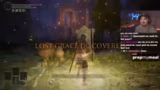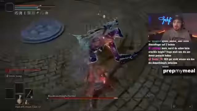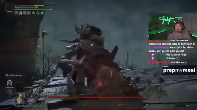 07:02:19Der Streamer wagt sich an die gefährlichsten Abschnitte des Speedruns. Bei Dracischer Baumschützel nutzt er einen riskanten Trick, indem er den Boss von einer Klippe stürzen lässt. Dies schlägt fehl und führt zu einem gefährlichen Kampf. Die folgenden Kämpfe gegen Malik und Godskin Duo sind aufgrund des geringen Schadens der Waffe sehr zäh und enden knapp. Der Streamer zeigt Nerven und muss mehrere Male von der Kante zurückweichen.