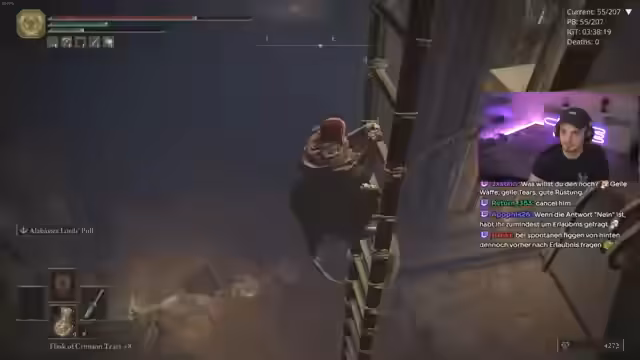 06:10:57Der Streamer überlegt, wann es sinnvoll wäre, die Waffe zu wechseln, und erwähnt, dass Statusschaden erst später im Spiel relevant wird. Er erklärt, dass die aktuelle Waffe aufgrund ihrer geringen Ausdauerkosten immer gut performen wird. Es wird über die Abkürzung BHB diskutiert und der Streamer äußert den Wunsch, zu zwei Great Stars zu wechseln, sobald er eine zweite findet. Die Regeln des Challenge-Modus werden erneut erläutert: Bei Gleichstand entscheidet die In-Game-Zeit. Der Streamer erkundet ein dunkles Gebiet und sucht nach wichtigen Items. Er kommentiert seine Geldausgaben und die Nützlichkeit der gefundenen Tränen. Es wird kurz über die Waffe Alabaster Lordsword gesprochen und ihre Stärke aufgrund der geringen Ausdauerkosten ihrer R2-Attacke hervorgehoben. Der Streamer hat Spaß beim Runenfarmen und tötet Gegner von hinten. Er betont, dass man manchmal tun muss, was das Herz einem sagt.