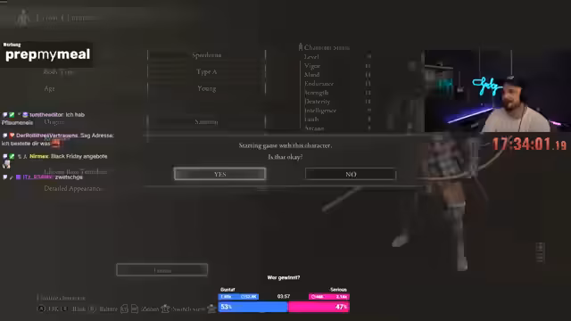 03:11:03Nach der Waffenauswahl bereiten sich die Streamer auf den Start des Speedruns vor, wobei sie eine Dauer von mindestens zwei Stunden und viel Nervenverlust erwarten. Es wird entschieden, den Samurai als Startklasse zu wählen, da dies die einzig sinnvolle Möglichkeit sei, den ersten Boss zu besiegen. Die Notwendigkeit eines besseren Builds für das Endgame wird betont, da ein Durchrennen ohne Level nicht funktionieren wird. Das Ornamental Straight Sword wird näher betrachtet; es skaliert mit Dex und Stärke und hat einen Flat Damage-Buff, der das Early-Game erleichtern soll, aber danach eine Katastrophe werden könnte. Die Streamer sind bereit für den Run, obwohl sie eine 50%ige Chance sehen, ihn nicht zu beenden. Der Start des Timers bereitet Probleme, da er nicht sofort anläuft, was zu einem leichten Zeitnachteil führt. Es wird erwähnt, dass ein 400-seitiges Buch über die Lore von Elden Ring veröffentlicht wurde, was als positiv empfunden wird.