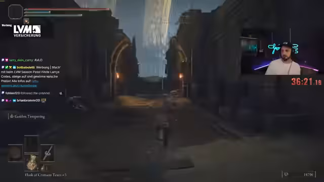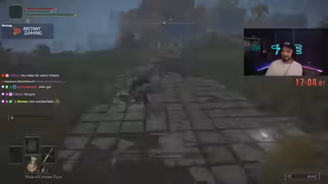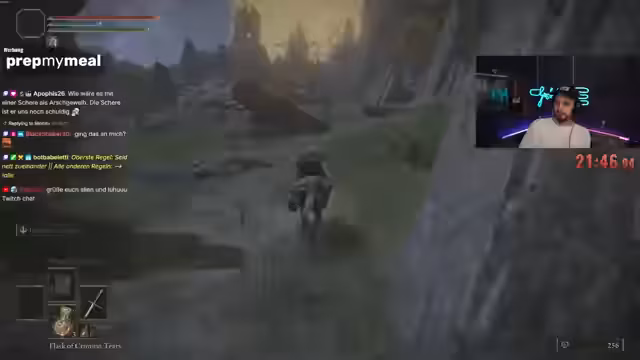01:43:06Der Streamer hat die Axt noch nicht und befindet sich erst am Grace beim Fahrstuhl. Er entscheidet sich, das Grace nicht mitzunehmen, um Zeit zu sparen, hofft aber, nicht zu sterben, was ihm bisher noch nie passiert ist. Es wird über ein gefährliches Mausoleum gesprochen, dessen Katapulte man umgehen kann, indem man weit links reitet. Er kassiert ein Mana und plant, sich beim Decktus hinzusetzen und zu leveln, um sich teleportieren zu können. Er hat bereits Steine gekauft, um sein Geld nicht zu verlieren, und plant, einen Ritter zu meiden, vor dem er Angst hat. Er bemerkt, dass er genau 256 Runen übrig hat, was er als Zufall anzweifelt.