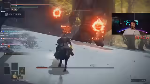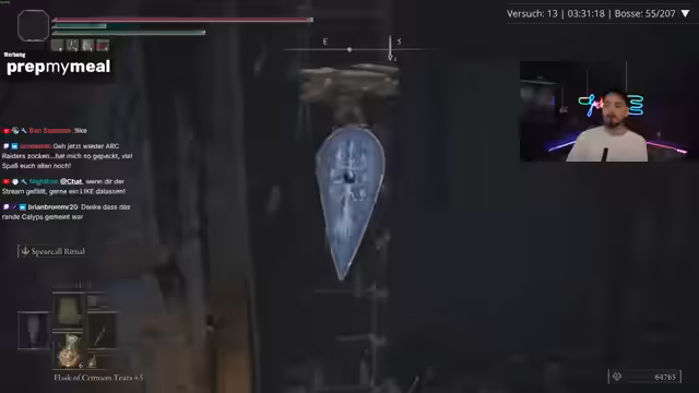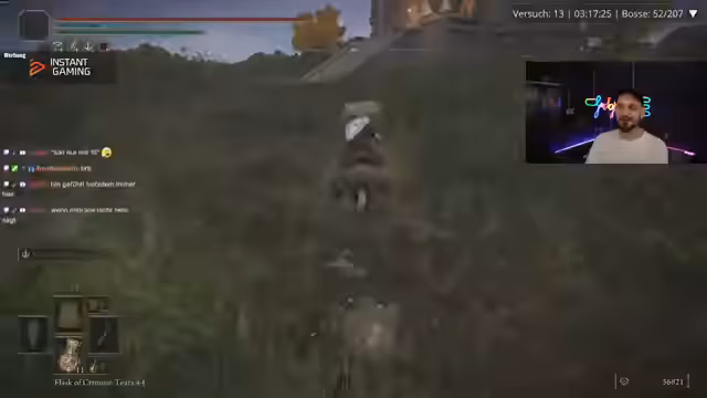 00:50:51Die Katakombe erweist sich als äußerst herausfordernd, da die Gegner strategisch platziert sind und der Streamer Schwierigkeiten hat, voranzukommen. Er muss Bolzen kaufen, um einen Fernkampfgegner zu besiegen, stellt aber fest, dass er nicht genug Geld hat. Die Preise für die Bolzen werden als 'Inflation' und 'crazy' bezeichnet. Nach einigen Versuchen gelingt es ihm, den Gegner mit Headshots und Blutungsschaden zu besiegen. Er trifft auf einen DLC-Vogel, der ihm fast ein Drittel seines Lebens nimmt, was er als 'lächerlich' empfindet. Es wird über die Waffenwahl für die bevorstehenden Speedruns mit SeriousChallenges gesprochen. Gustav darf eine Waffe wählen und SeriousChallenges eine andere. Gustavs Wahl fällt auf 'Rosos Axt', eine seiner Lieblingswaffen, deren Fundort er jedoch erst nachschlagen muss. Es wird diskutiert, welche Startklasse am besten für die Stats von Rosos Axt geeignet ist, wobei der Prisoner als die logischste Wahl erscheint.