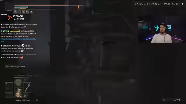 04:49:46Der Speedrun wird als erfolgreich bewertet, trotz einiger Schwierigkeiten bei Bossen wie Gideon und Radagon. Der Streamer ist zufrieden mit seiner Leistung und der des Partners, der mit einer Zeit von 1:24:28 abschließt, während der Streamer 1:26:22 erreicht. Es wird festgestellt, dass die verwendete Waffe, obwohl als 'Lull-Waffe' bezeichnet, bei richtiger Anwendung und einem optimierten Build durchaus effektiv sein kann. Nach dem Speedrun wird die 'French Challenge' als nächstes Ziel angekündigt. Der Streamer befindet sich im Altus-Plateau und hat 110 Bosse in 5 Stunden und 54 Minuten besiegt. Er erwähnt, dass er viele schwere Bosse wie Malenia und Radahn P2 noch vor sich hat. Es wird auch über die Regeln der French Challenge diskutiert, insbesondere das Einsammeln von Items und die Interpretation der Regeln. Der Streamer betont, dass er nur Items auf dem Weg einsammelt und keine Extrawege dafür geht, was zu unterschiedlichen Meinungen über die Einhaltung der Regeln führt.