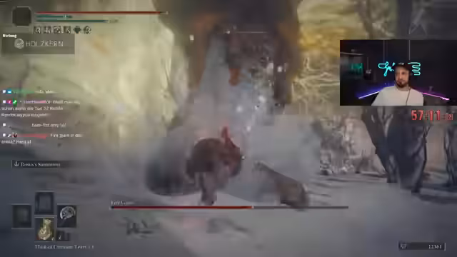 00:10:52Der Streamer kündigt an, dass dies der letzte Stream für diese Woche sei, da er morgen und Samstag nicht da sein wird. Am Sonntag könnte er sehr spät online kommen. Im Spiel konzentriert er sich auf einen Bosskampf, bei dem Magie-Schaden effektiv ist. Er besiegt den Boss mit Leichtigkeit und zeigt sich beeindruckt von der Stärke seiner Waffe. Es werden weitere Bosse wie Makar, Omenkiller und Nightscav erwähnt, die noch besiegt werden müssen. Die Waffe, ein Speer, wird als 'übel fun' beschrieben, obwohl Speere normalerweise nicht seine bevorzugte Waffenart sind. Er sammelt einen Smithing-Stone-Bellbearing ein, den er dringend benötigt. Es wird auch kurz über seine schlechte Schlafqualität und Kopfschmerzen gesprochen, bevor er sich wieder dem Spiel widmet.