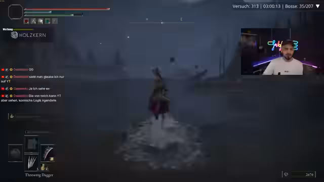 04:50:55Der Streamer berichtet, dass er nicht bei den Stream Awards dabei war, da er und sein Team vergessen hatten, sich anzumelden. Er beschreibt einen extrem schwierigen Kampf in Elden Ring gegen zwei Elite Mesmer Soldier, die ihn gleichzeitig angegriffen haben. Er fühlt sich machtlos und ist überzeugt, dass es keine Chance gab, diesen Kampf zu gewinnen, da die Gegner unüberwindbar waren. Er vermutet, dass ein Fehler in seiner Mod, die Farben tauscht, dazu führte, dass er einen der Gegner nicht sehen konnte. Die psychische Belastung dieser Challenge sei brutal. Aufgrund der Schwierigkeiten und der langsamen Downloadgeschwindigkeit von Tarkov entscheidet er sich spontan, Hollow Knight zu spielen. Er erinnert sich kaum an die Steuerung und den Spielverlauf, da er das Spiel zwei Wochen lang nicht gespielt hat. Trotzdem stürzt er sich in einen Bosskampf und gewinnt diesen überraschend schnell, was ihm ein Gefühl der Zufriedenheit gibt. Er bemerkt, dass das Heilen in Bosskämpfen in Hollow Knight nahezu unmöglich ist, es sei denn, man kennt die Bossmechaniken sehr gut.
